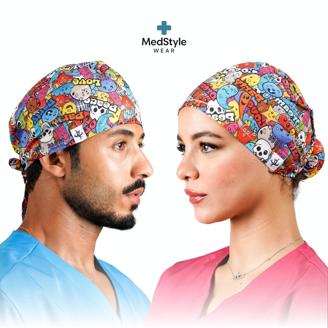 Gorro quirúrgico de alta calidad, diseñado para brindar comodidad durante largas jornadas de trabajo. Fabricado con tela ligera, transpirable y resistente, se ajusta perfectamente gracias a su elástico y cintas posteriores. Ideal para personal médico, odontológico, veterinario y cualquier entorno que requiera higiene y estilo. Lavable, reutilizable y disponible en una amplia variedad de estampados originales.